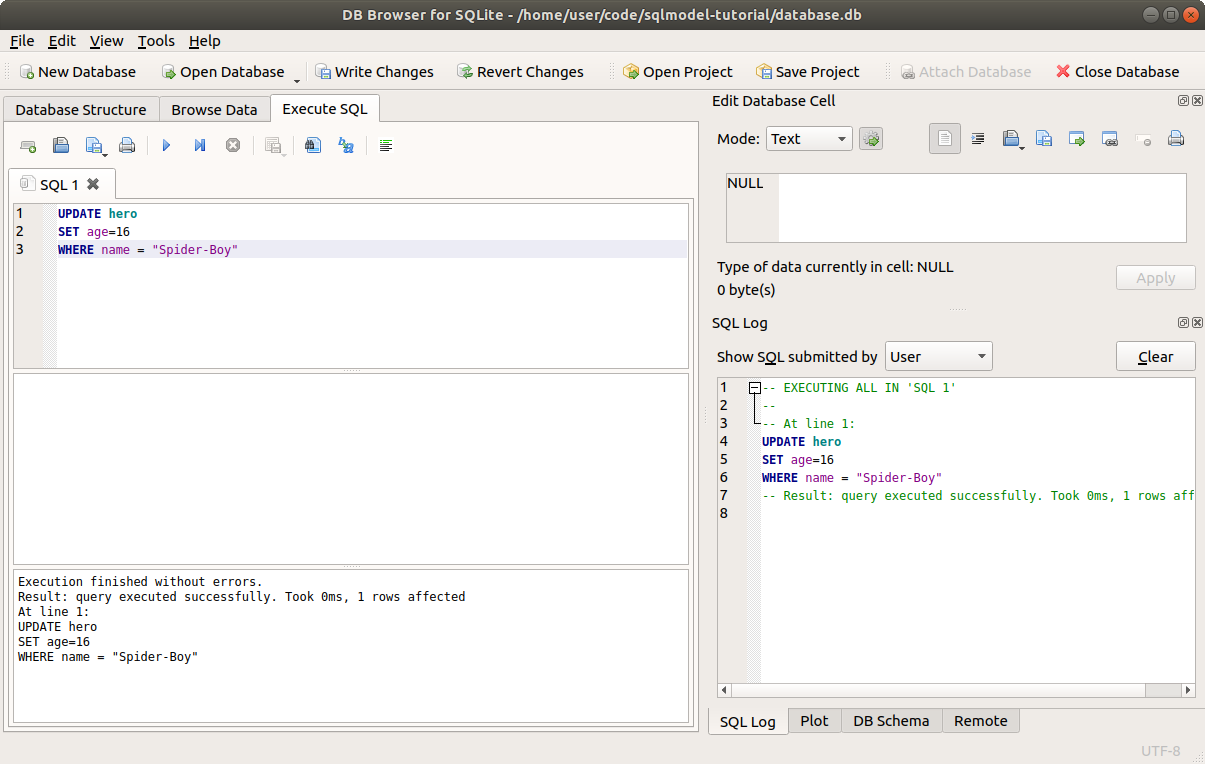 Execute the select statement. This generates the output: INFO Engine BEGIN (implicit) INFO Engine SELECT hero.id, hero.name, hero.secret_name, hero.age FROM hero WHERE hero.name = ? INFO Engine [no key 0.00020s] ('Captain North America',)!!! tip See the BEGINat the top?This is SQLAlchemy automatically starting a transaction for us. This way, we could revert the last changes (if there were some) if we wanted to, even if the SQL to create them was already sent to the database.